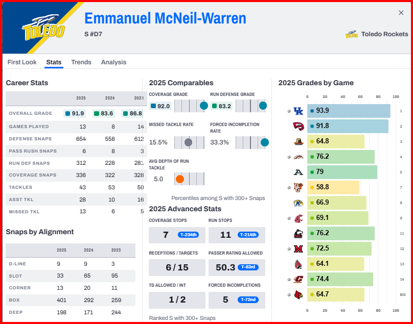 McNeil-Warren was the statistical engine of the Toledo defense in his final season, delivering production that rivaled any safety in the country.