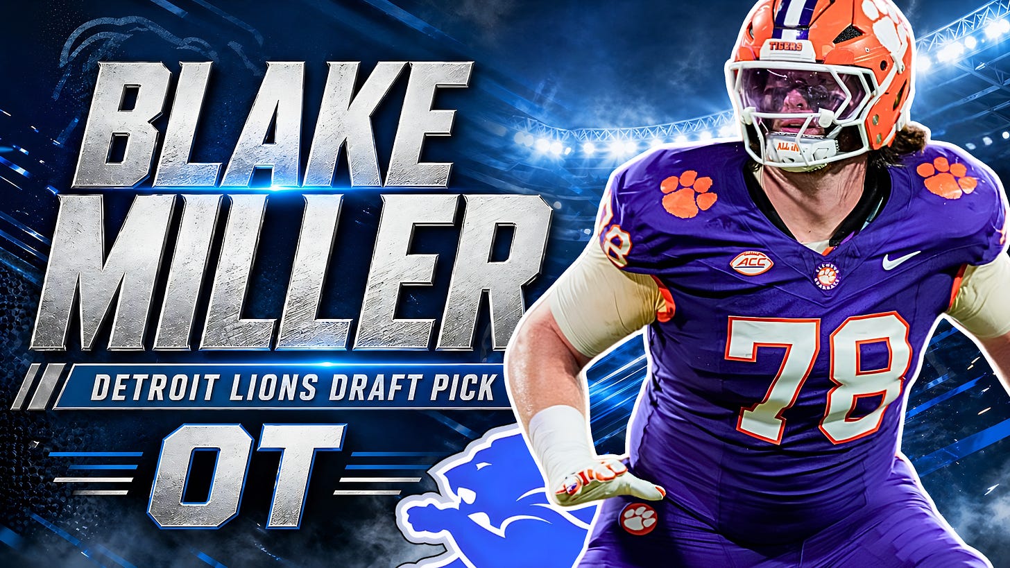 The Detroit Lions did not draft Blake Miller at No. 17 for depth. They drafted him to protect Jared Goff, stabilize right tackle, and give Brad Holmes the flexibility to make a bigger offensive line decision with Penei Sewell. Miller arrives from Clemson with 54 career starts, a school-record snap résumé, and a right-tackle identity built on toughness, availability, and pass-protection trust. This profile breaks down why Detroit made the pick, what Miller brings on tape, where he fits in the Lions’ run-first offensive structure, and whether this selection gives Dan Campbell the trench answer his offense needed before the window gets more expensive.