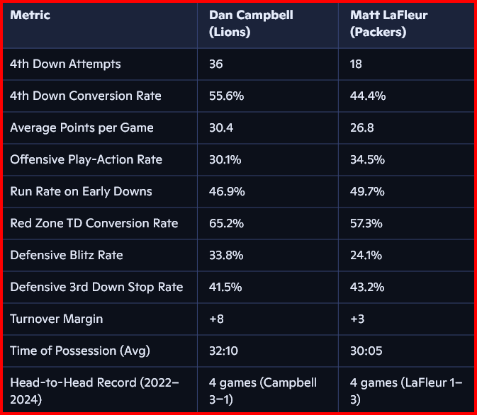 Defensively, LaFleur’s staff will need to contain Jahmyr Gibbs and David Montgomery without overcommitting. The Lions’ ability to generate explosive plays off play-action makes discipline in the second level critical. If Green Bay can force third-and-long situations and limit Campbell’s fourth-down aggression, LaFleur’s methodical style could grind out a win.