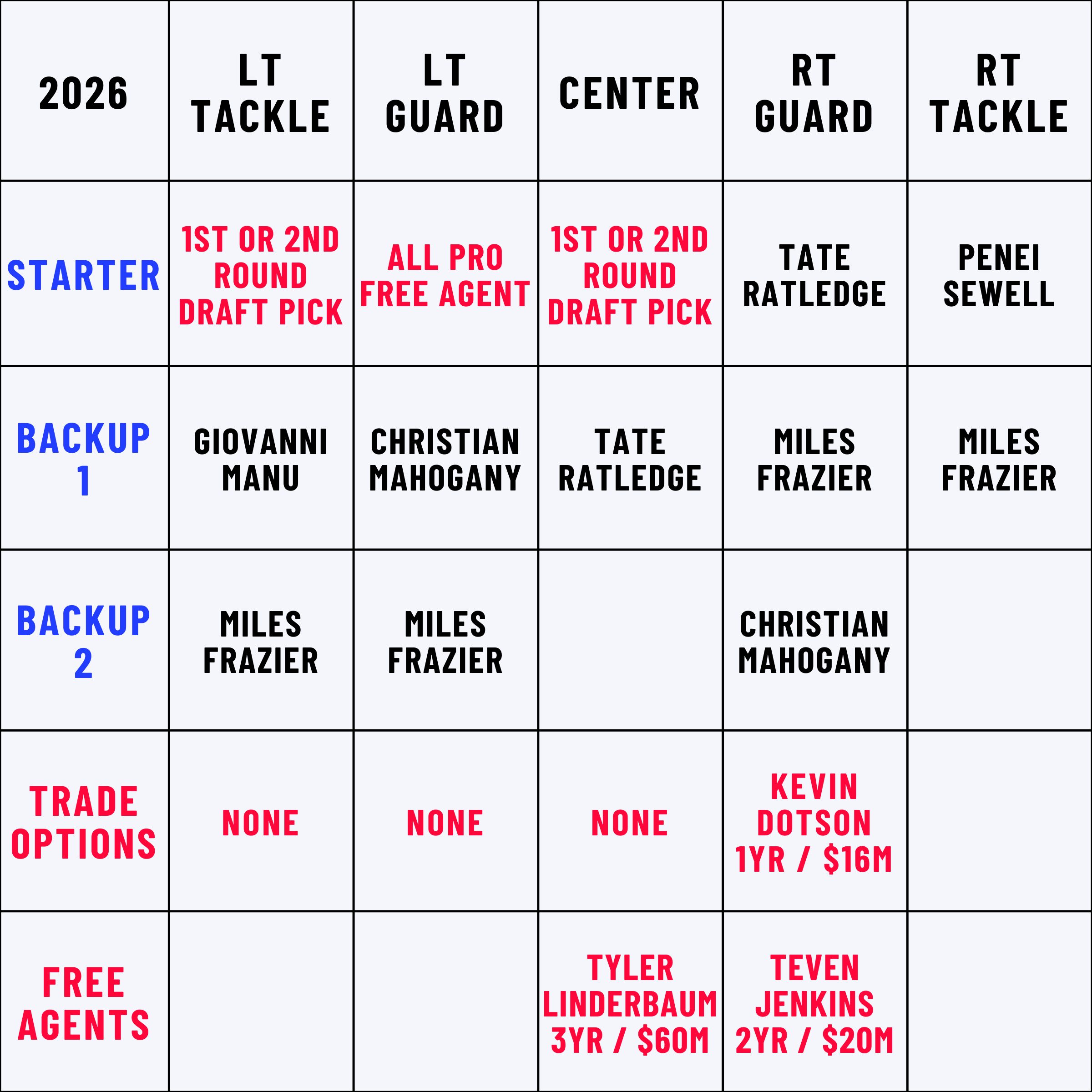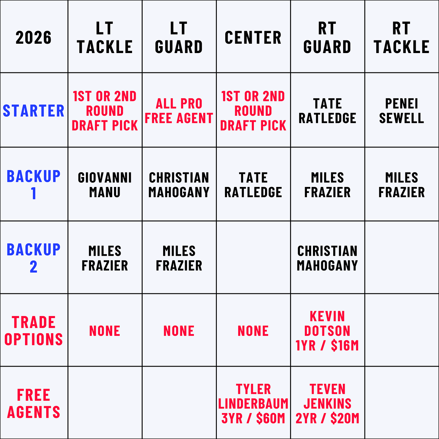 Should the Lions opt to go all in on the best free agent center Tyler Linderbaum. Tate Ratledge would likely remain at right guard. This gives the Lions the option to find their left tackle for the future in the draft and allow Frazier and Mahogany to battle it out for the final left guard spot.