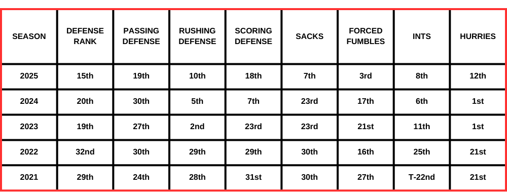 2025—Kelvin Sheppard has managed well, even after injuries once again putting this team against the wall. Even with the midseason dip, Sheppard’s defense still sits inside the Top 15 overall. The numbers tell the story: strong against the run (13th), disruptive in the pass rush (7th in sacks | 12th in hurries), and opportunistic in turnover creation (3rd in forced fumbles, 10th in interceptions). The dip—post the bye-week reflects attrition in the secondary, and even after four major statistical let down games—this unit has already proven it can perform at a Top 5 level.