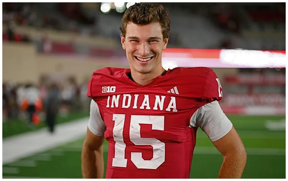 Before arriving in Bloomington Mendoza was the definition of a “just-a-guy.” Scouts viewed Mendoza as a low-ceiling prospect who struggled to elevate a team beyond its baseline. Over two seasons at Cal (2023–2024), he was mediocre at best, battling through a 6-7 record both years. While he showed flashes of accuracy, his production was middling: he totaled 30 passing touchdowns against 16 interceptions in 20 starts.