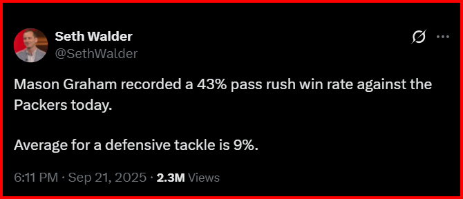 Early-season data confirms Jared Goff has picked up right where he left off in 2024 with one major difference. Goff has been more efficient, more accurate, and more turnover-averse under pressure. He’s been pressured on 30 of 102 drop backs (29.4%), absorbing four (4) sacks in Week 1 but none (0) in Weeks 2 and 3. That shift reflects a clear uptick in communication and offensive line cohesion, allowing Goff to stay on schedule, work through progressions, and deliver strikes with precision.
