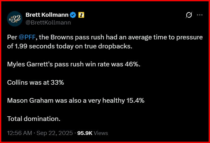 The Browns will test Detroit with twists and interior stunts (Collins + Graham), communication between Glasgow and Mahogany is critical. If Detroit passes off games cleanly and Goff maintains his 2.37s average time to throw vs. man, the Lions can blunt Cleveland’s rush.